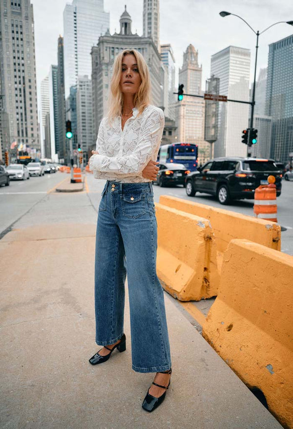 Chanel the iconic 1970s flair with these stylish jeans with a wide-leg silhouette. Featuring our signature high waist and chic flap pockets on the hips, they exude vintage charm. The double button closure adds a touch of retro sophistication, while the washed look evokes memories of classic denim from the golden era. Complete your ensemble by tucking in a printed tee and slipping into brown suede boots for a timeless yet contemporary look.