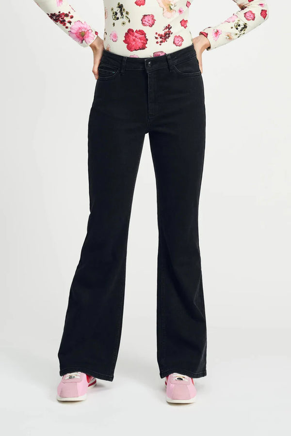 These black flared jeans with wash have a convenient button and zip closure. The timeless fit combined with the rugged appearance creates a stylish look.