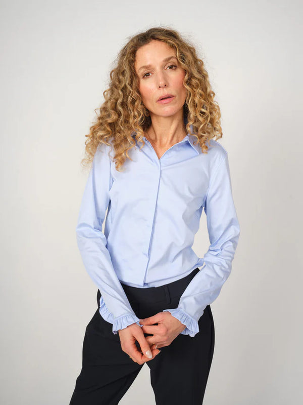 Seeking to infuse your ensemble with a dash of femininity? Designed in a sleek, slim silhouette, this piece is made from ultra-soft, stretchable material and features a traditional collar, elegant ruffled cuffs, and a timeless button-up front. Pair it with structured pieces, allowing the charming ruffled cuffs to subtly show from under the sleeves.