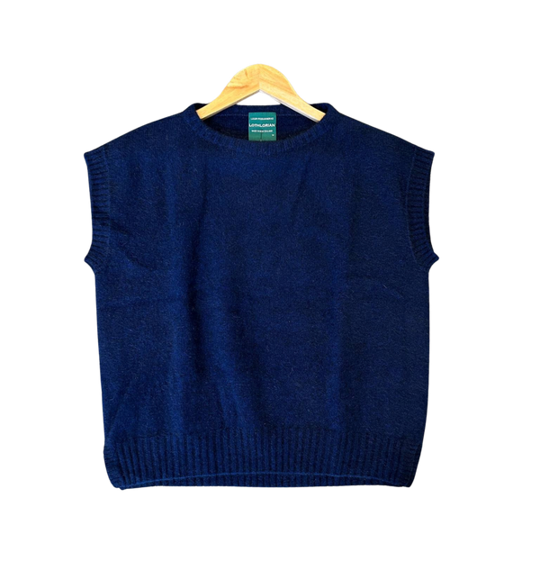 This simple crew neck vest features an extended shoulder line and rib hem with side splits. Sitting comfortably on the hip, the vest's relaxed fit allows it to be layered over shirts or long-sleeve tops without adding bulk, making it a versatile piece for all seasons.
